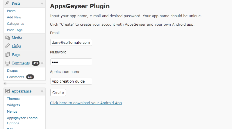 Here you enter your email and password. Be sure to enter this information correctly, as you’ll need it to log in to your AppsGeyser Dashboard later on. Provide your app with a name.
