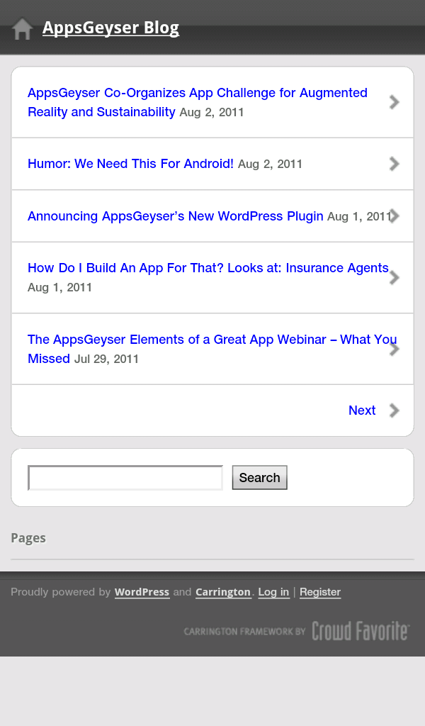 You’ll also need to have one of these plugins installed: WordPress Mobile Pack or Carrington Mobile Theme. If neither of these is installed, follow the instructions below for installing a plugin before you install the AppsGeyser plugin to install one of these.