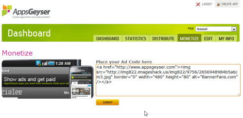 13. Hit Ctrl-V to paste the code in your AppsGeyser Monetize tab. Click Submit!
