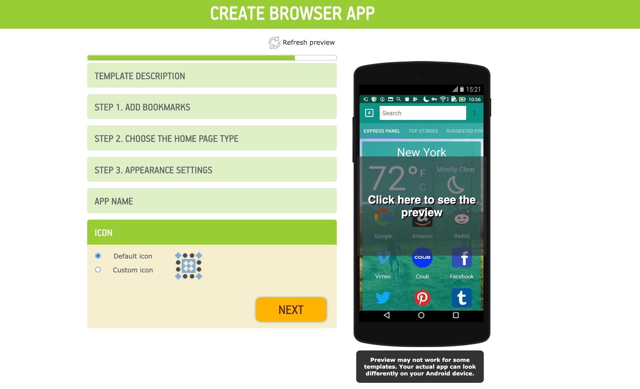 A big bonus point of the Appsgeyser browser creation process is the fact that you are able to fully customize your browser by adding your own background image and adding your own bookmarks such as Facebook, Twitter, YouTube, or any other favorite website. After you have chosen your Ideal homepage in order to change the appearance of the default browser look, you will be able to upload your own icon image and name your free browser. The Appsgeyser browser app creator makes the process very very easy. Remember, the entire process is completely free!