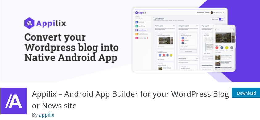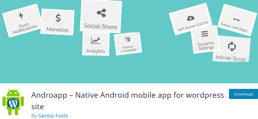 AndroApp is a feature-packed plugin to transform a WordPress website into an android app without writing code. It has plenty of features such as push notification, social share, analytics tool, infinite scroll and various useful options to make the app user-friendly.