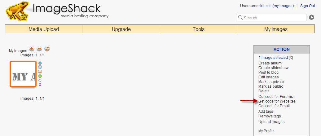 - Enter your email address to get an account. Then go to My Images and select the image you wish to use. Select Get Code for Websites from the menu to the right.