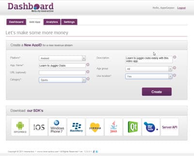 - This will take you to the Inneractive Dashboard. You’ll want to add your first app right away! Select Platform: Android, add your App Name, your website URL, Category, Description, Age Group, and whether you want Inneractive to use user locations to designate which advertisements are broadcast to them. Using location is likely to increase your click-through rate, so we recommend it. When you’re finished, click CREATE